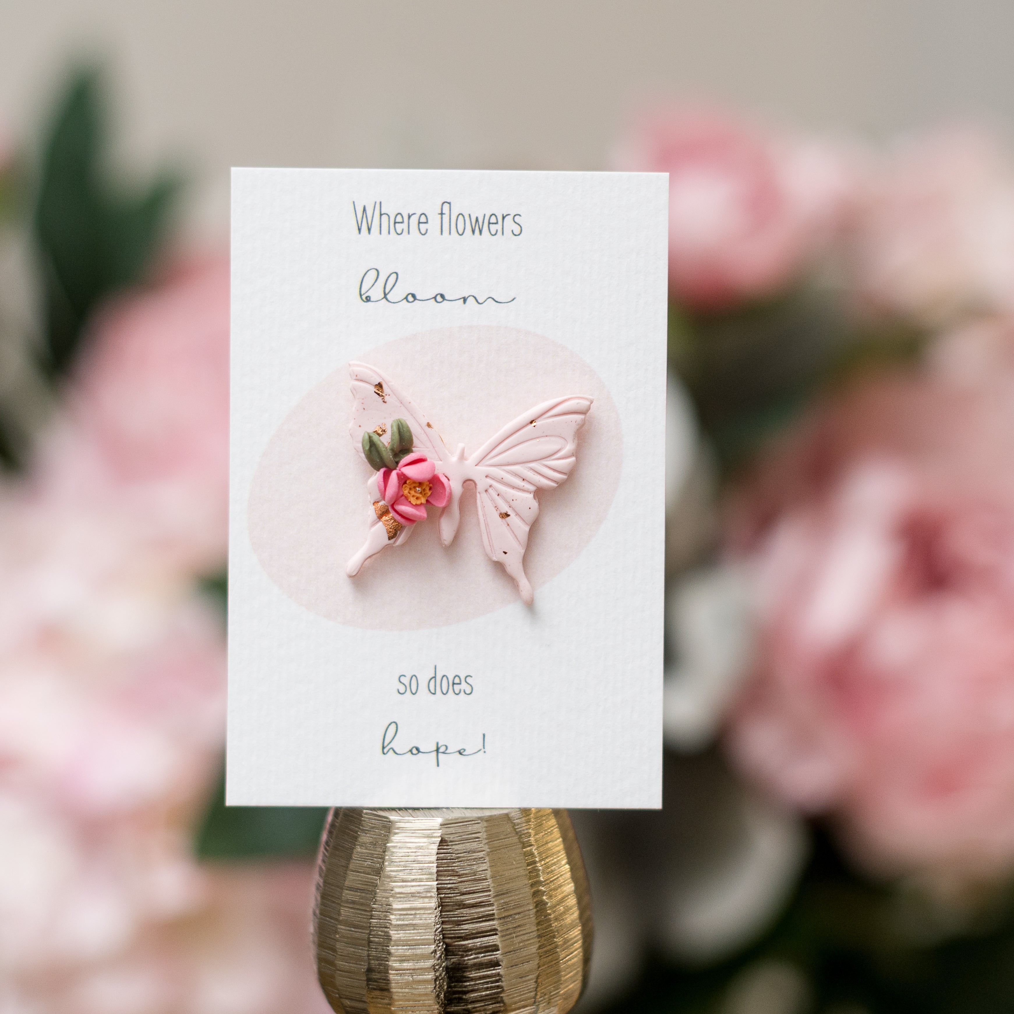Mărțișor din lut polimeric cu ac de broșă, fluture roz cu flori