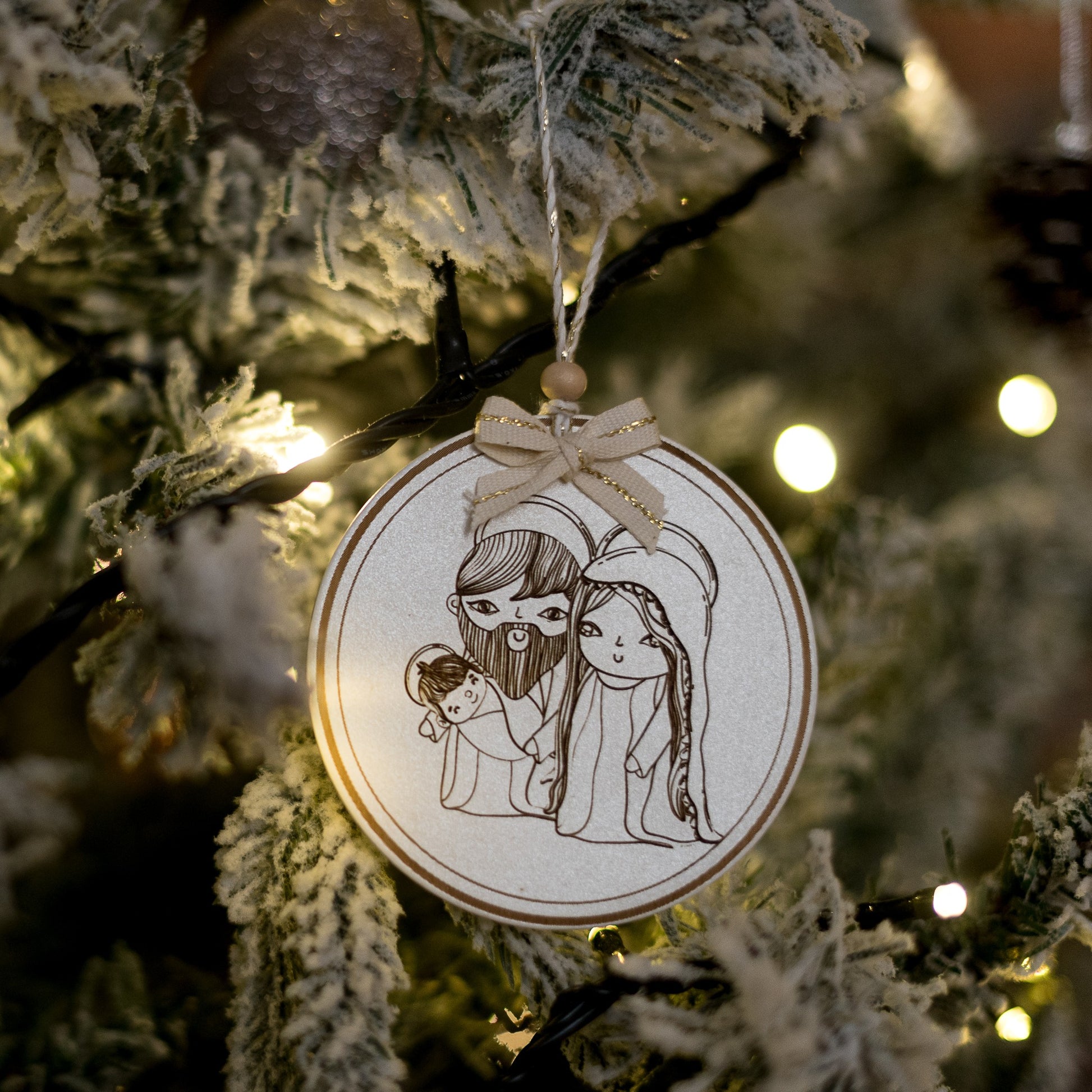 Glob din lemn vopsit alb cu sidef, cu Iosif, Maria și Pruncul