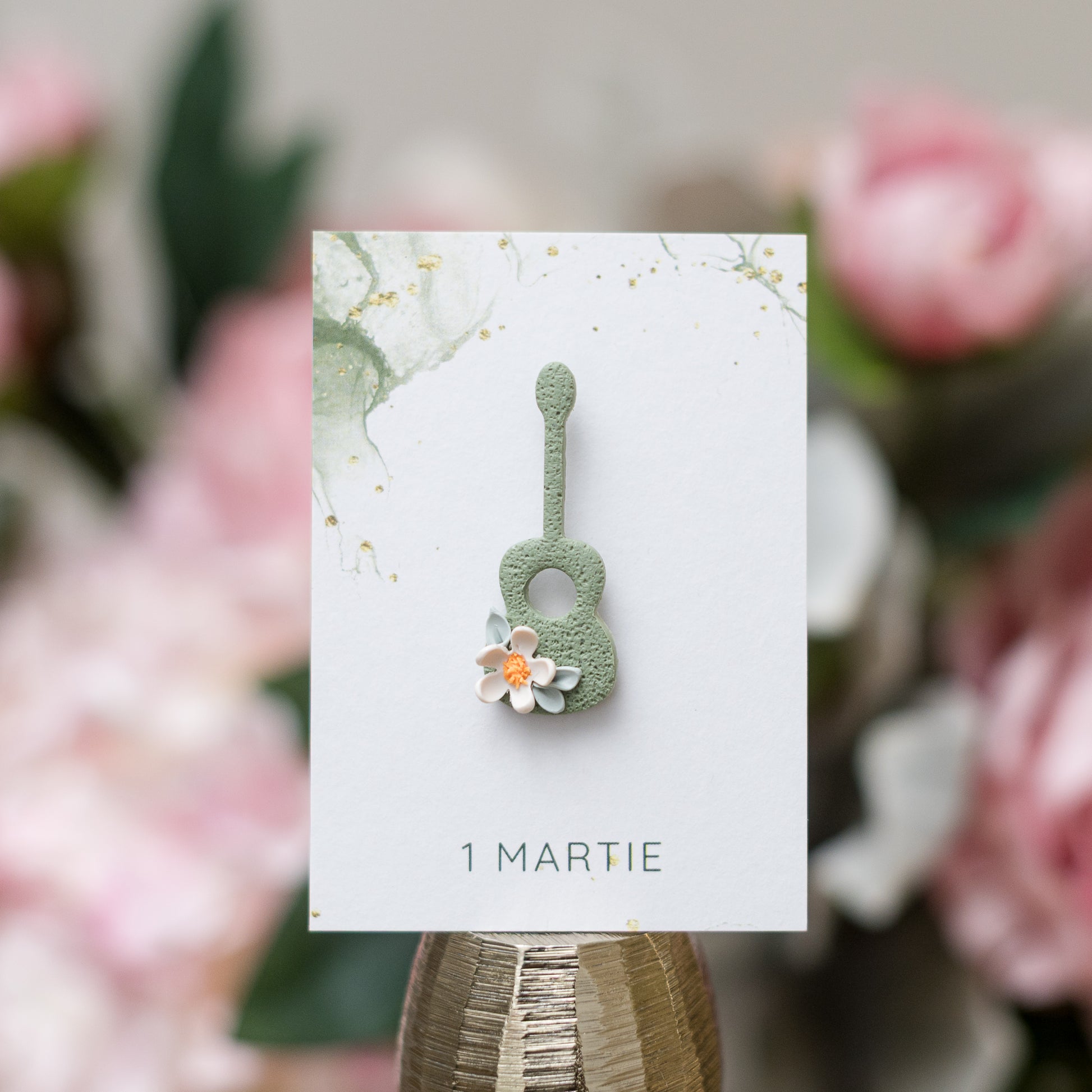 Mărțișor din lut polimeric cu ac de broșă, chitară cu flori
