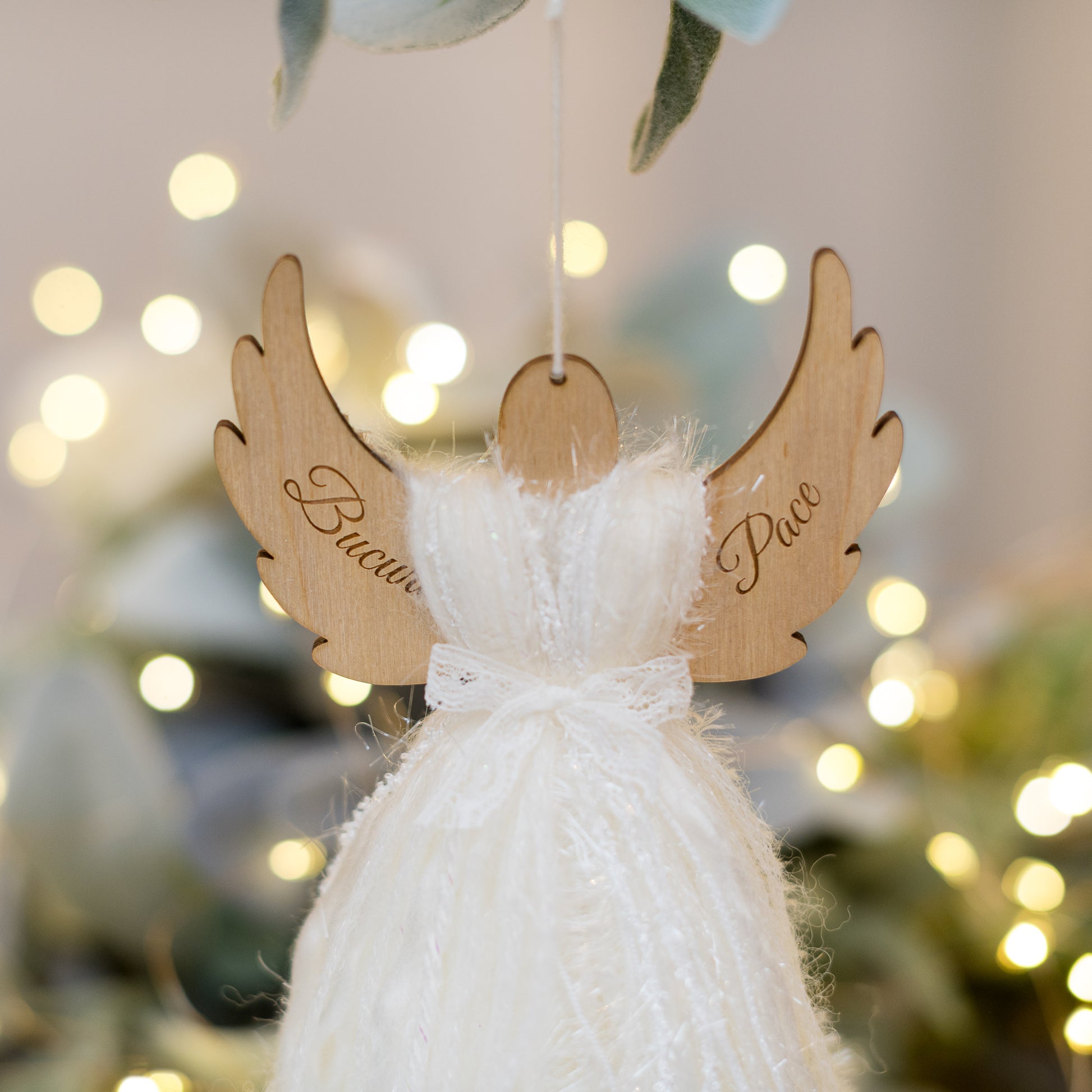 Ornament de brad - Îngeraș din lemn cu franjuri și urări gravate, BUCURIE și PACE