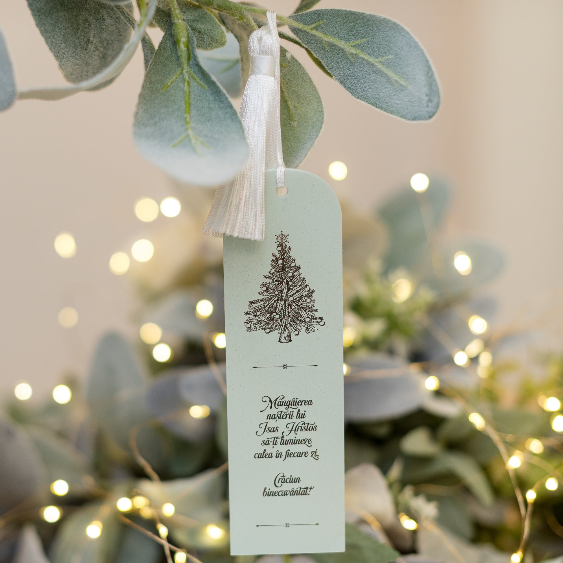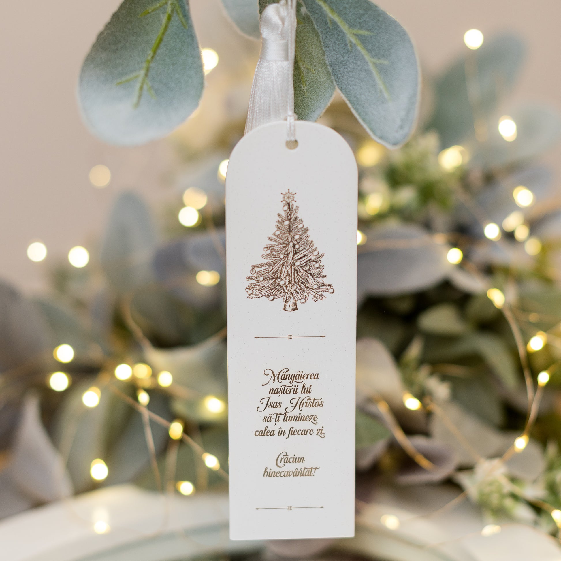 Semn de carte gravat cu urare de Crăciun și un brad vintage.